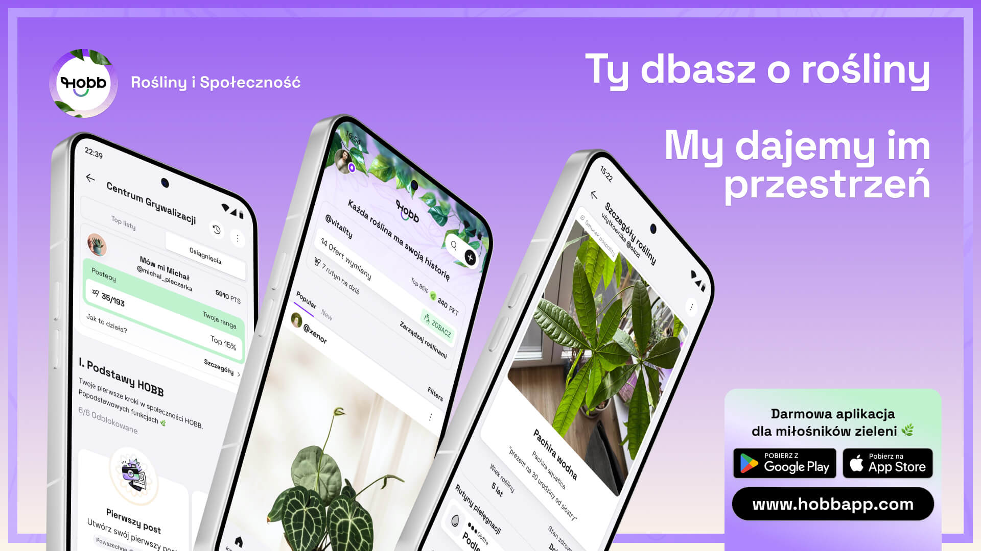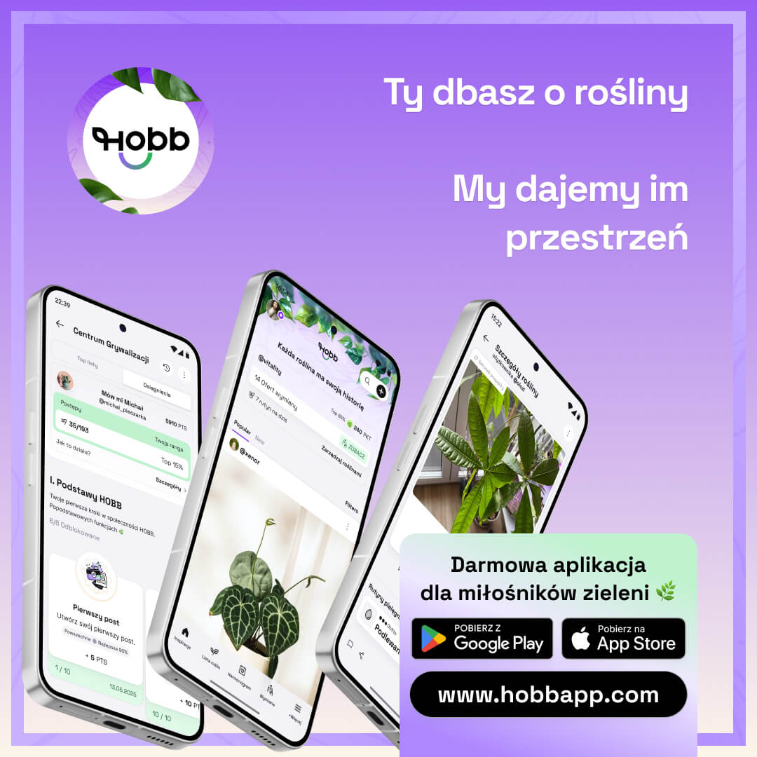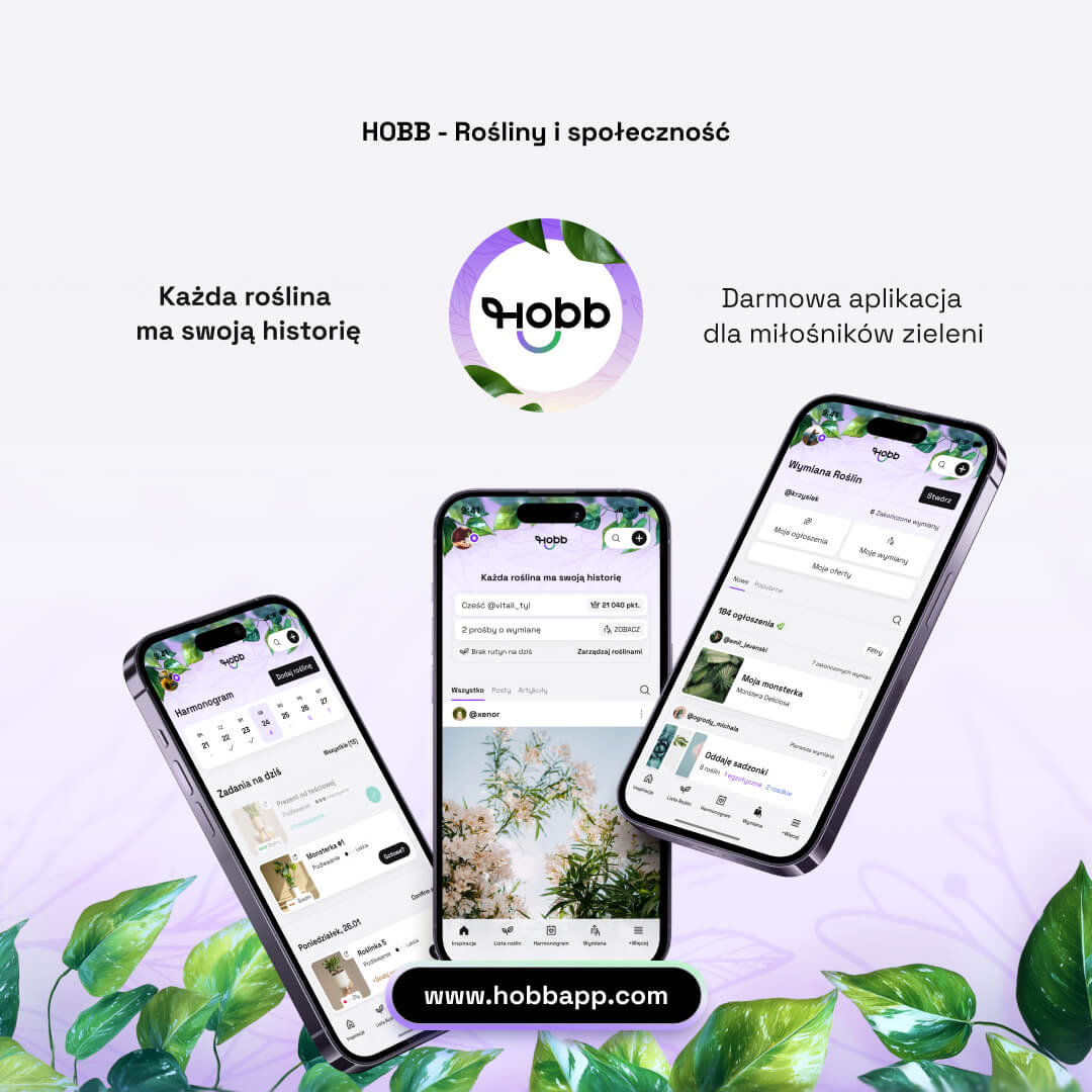 HOBB to bezpłatna aplikacja mobilna dla miłośników roślin, dostępna na iOS i Android. Łączy w jednym miejscu inteligentny harmonogram pielęgnacji, osobisty dziennik roślinny oraz funkcje społecznościowe – posty, artykuły, komentarze i bezpieczną wymianę roślin między użytkownikami. Aplikacja jest rozwijana przez HOBB MEDIA Sp. z o.o. z siedzibą w Białymstoku.