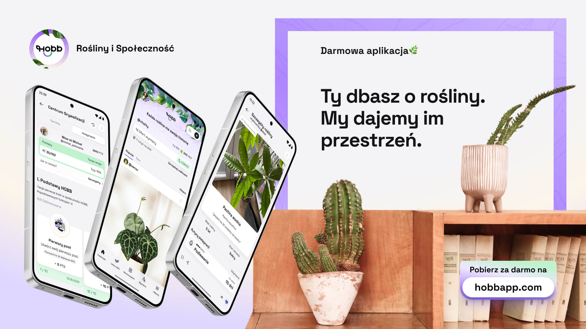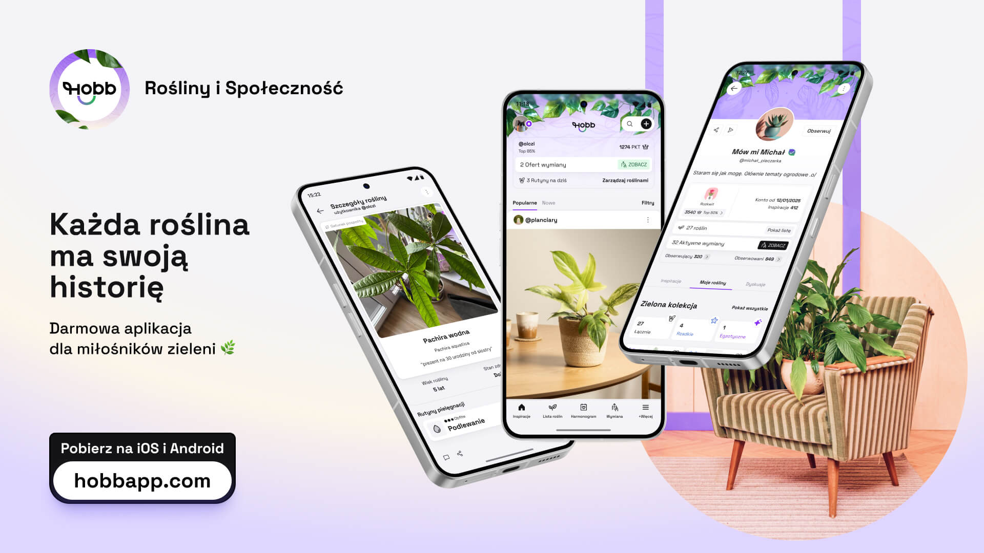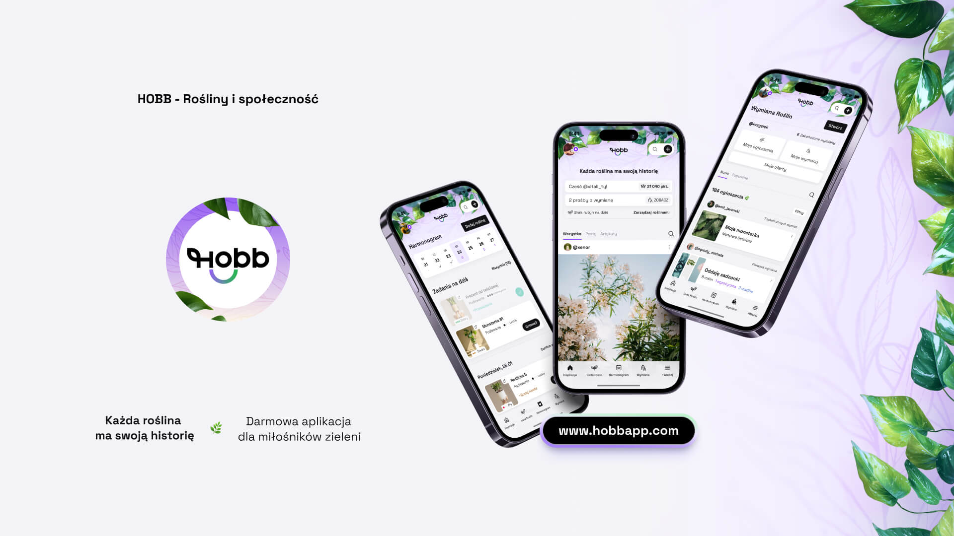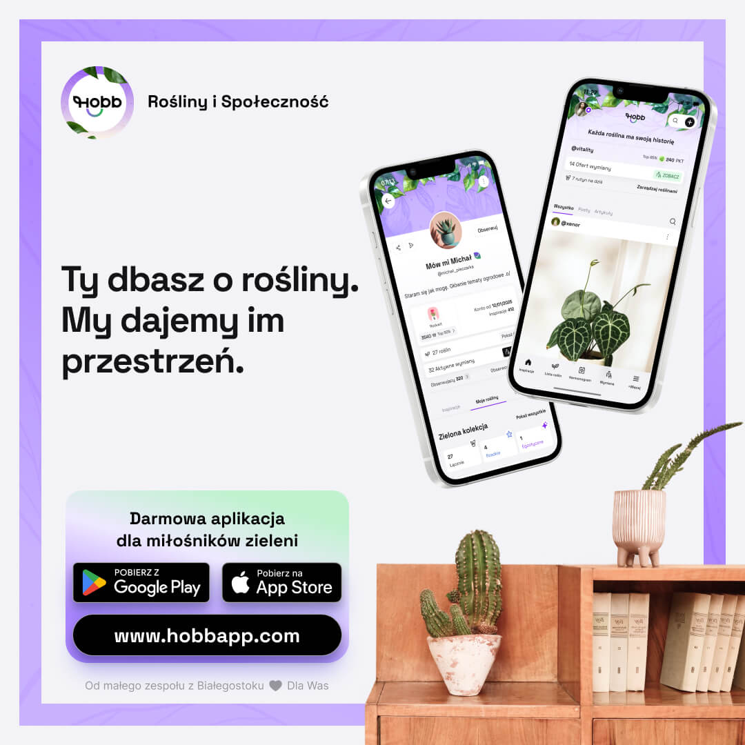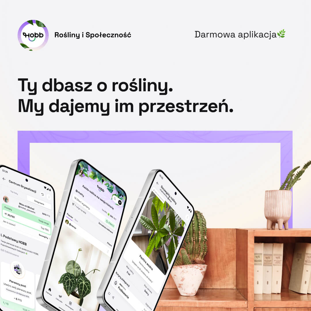 HOBB to bezpłatna aplikacja mobilna dla miłośników roślin, dostępna na iOS i Android. Łączy w jednym miejscu inteligentny harmonogram pielęgnacji, osobisty dziennik roślinny oraz funkcje społecznościowe – posty, artykuły, komentarze i bezpieczną wymianę roślin między użytkownikami. Aplikacja jest rozwijana przez HOBB MEDIA Sp. z o.o. z siedzibą w Białymstoku.