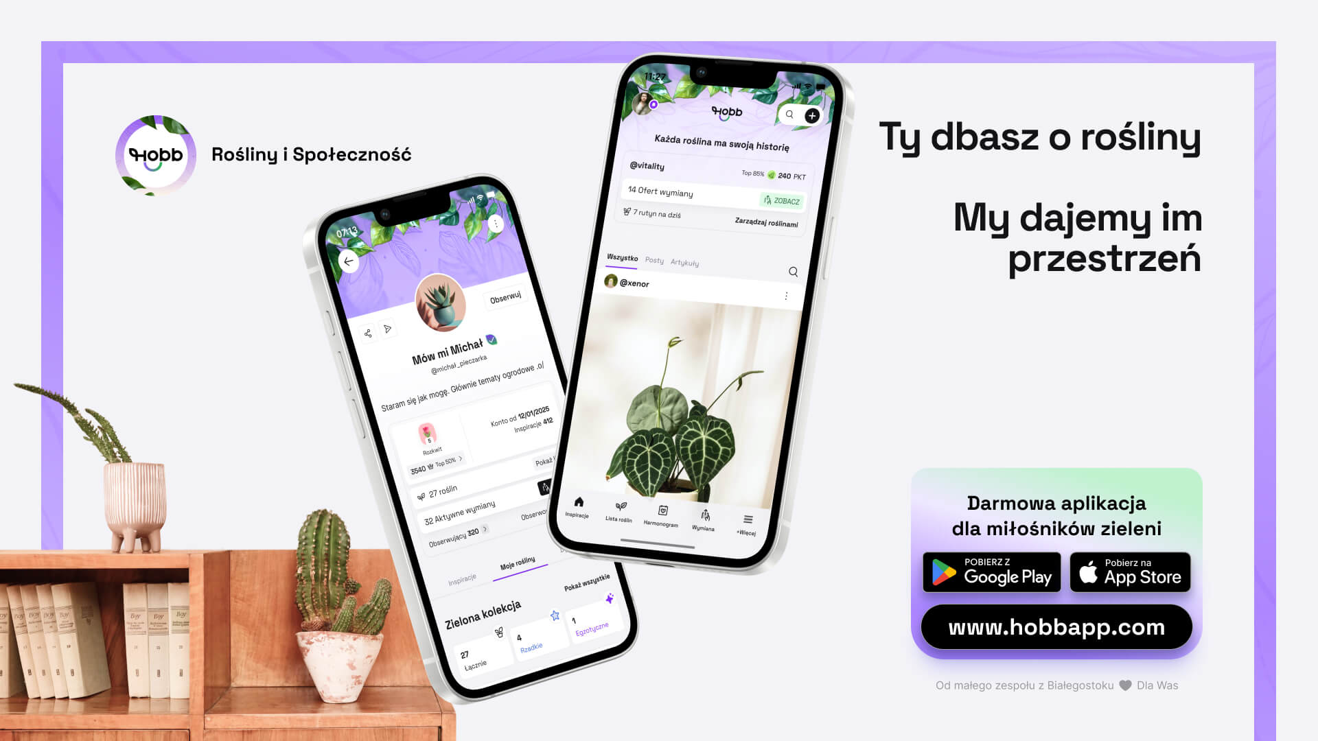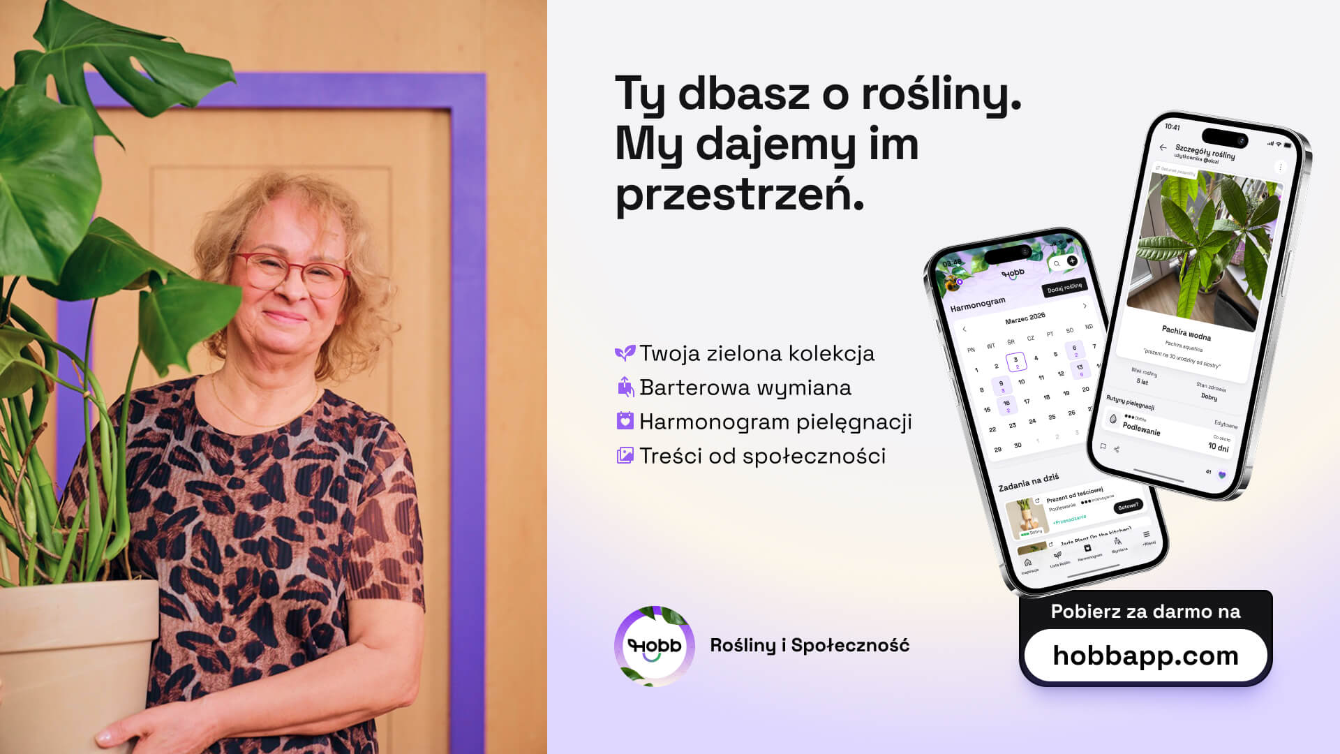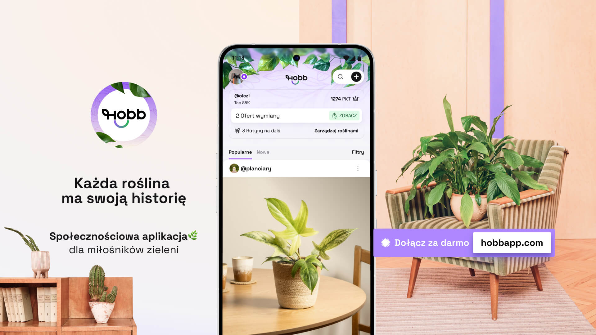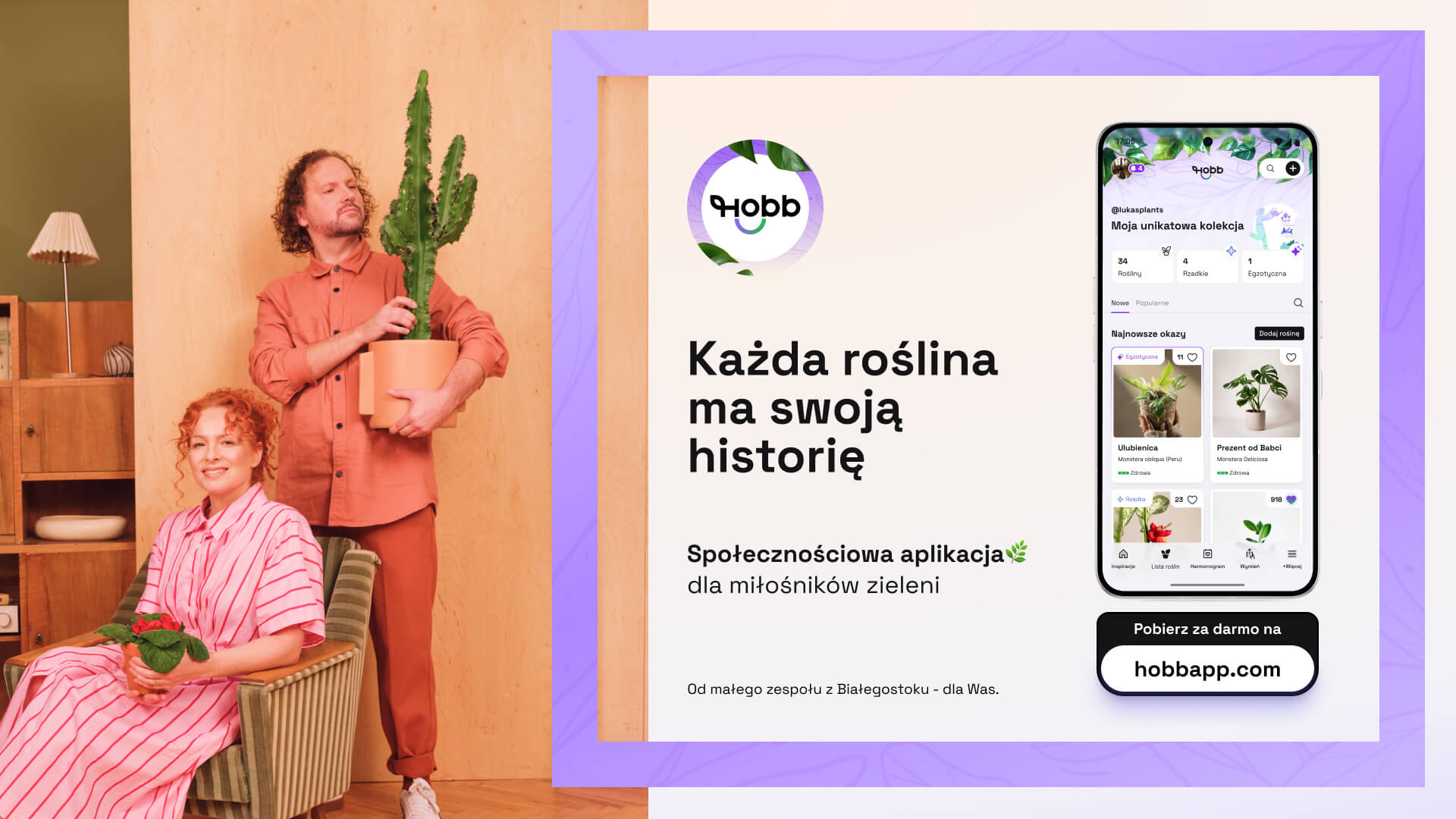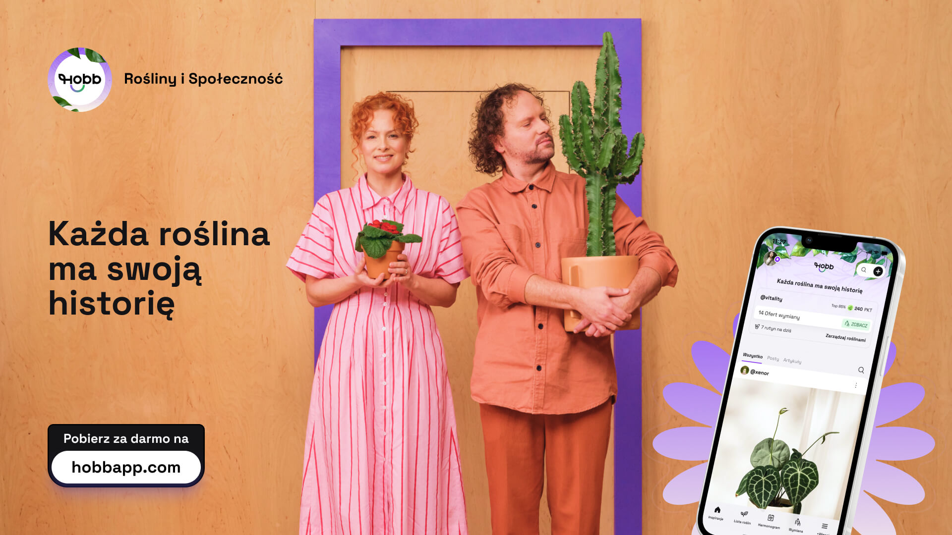 HOBB to bezpłatna aplikacja mobilna dla miłośników roślin, dostępna na iOS i Android. Łączy w jednym miejscu inteligentny harmonogram pielęgnacji, osobisty dziennik roślinny oraz funkcje społecznościowe – posty, artykuły, komentarze i bezpieczną wymianę roślin między użytkownikami. Aplikacja jest rozwijana przez HOBB MEDIA Sp. z o.o. z siedzibą w Białymstoku.